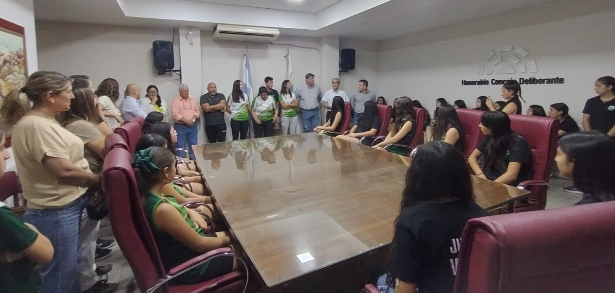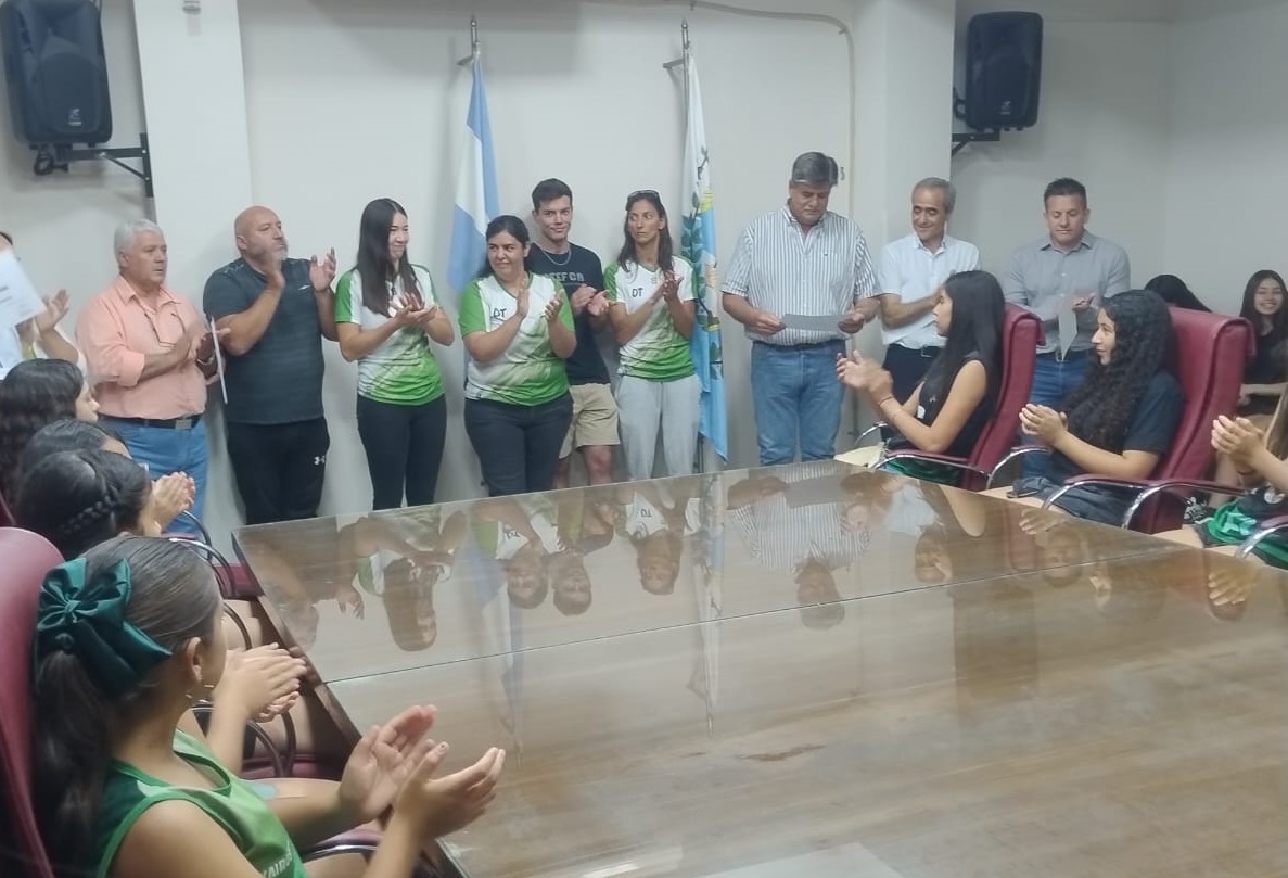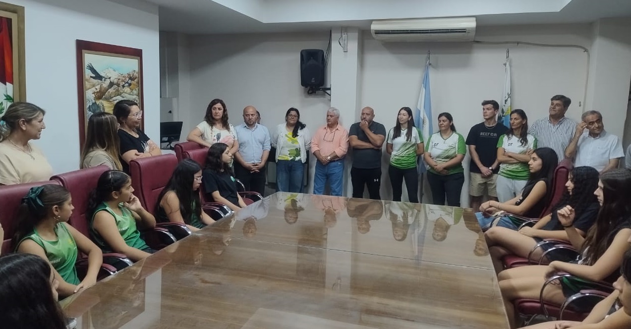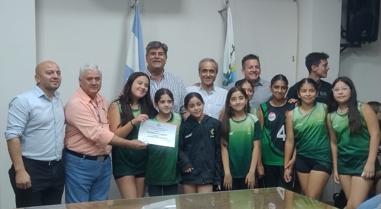 El Presidente del Concejo Ricardo Morcos y los Ediles Matías Manunccia, Lourdes Sosa, Darío González, Alberto Deblasis, Gabriela Guiñazú, Romina Maravilla y Santiago Roldán junto al Intendente Mario Abed, recibieron a las Categorías Femeninas Sub 12, Sub 14 (A y B) y Sub 16 de la Municipalidad de Junín, que participaron de las finales del Torneo Nacional Abierto de Vóley Federado en la Provincia de San Luis.